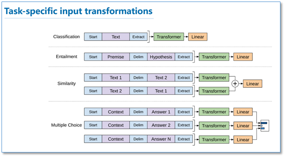 由于不同NLP任务的输入有所不同,在transformer模型的输入上针对不同NLP任务也有所不同。具体如下图,1️⃣ 对于分类任务直接将文本输入即可;2️⃣ 对于文本蕴涵任务,需要将前提和假设用一个Delim分割向量拼接后进行输入;3️⃣ 对于文本相似度任务,在两个方向上都使用Delim拼接后,进行输入;4️⃣ 对于像问答多选择的任务,就是将每个答案和上下文进行拼接进行输入。