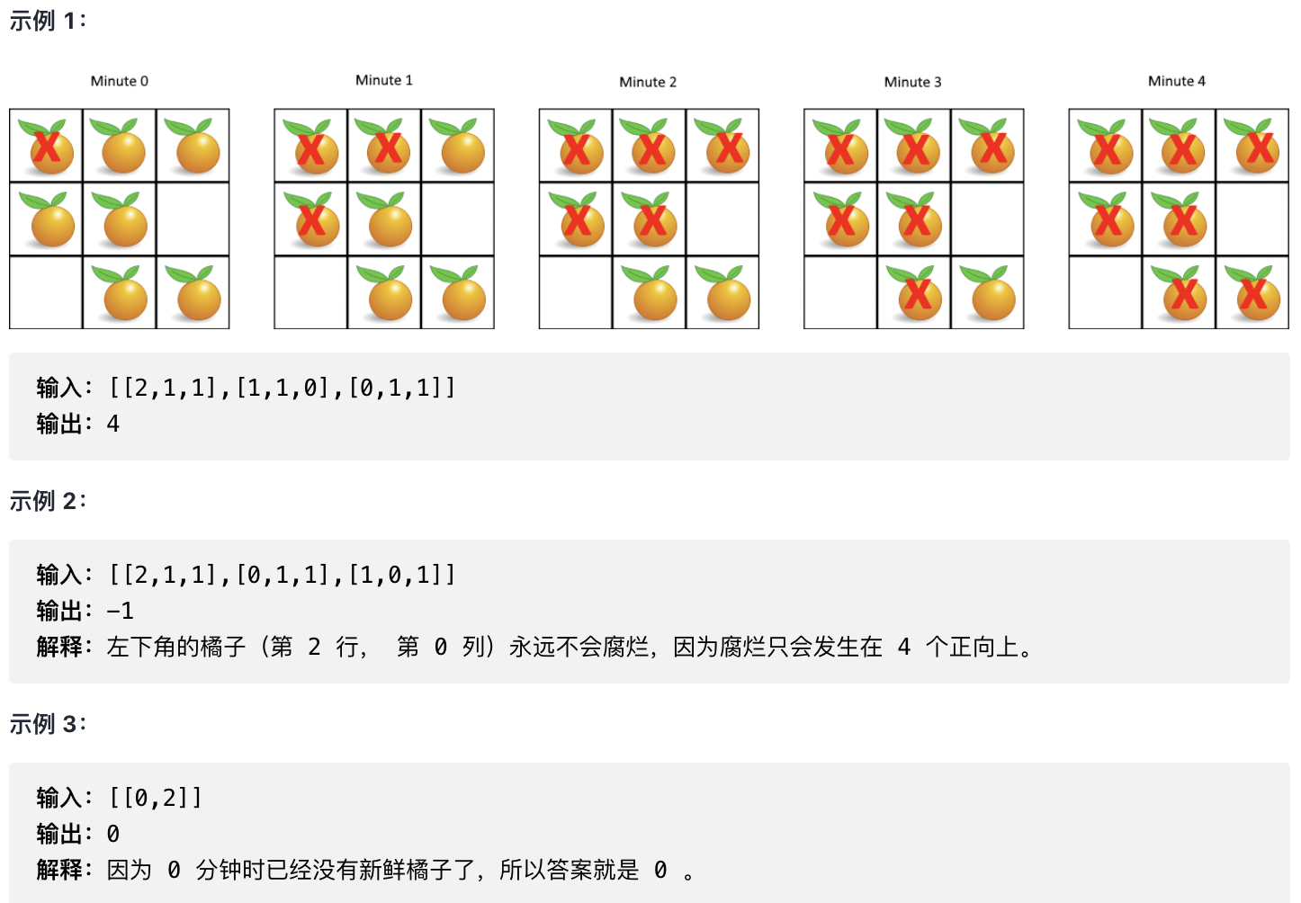 4.队列为空表示处理完成,腐烂的传播过程完成,橘子已经全部腐烂或者已经没有可以被影响的橘子了。