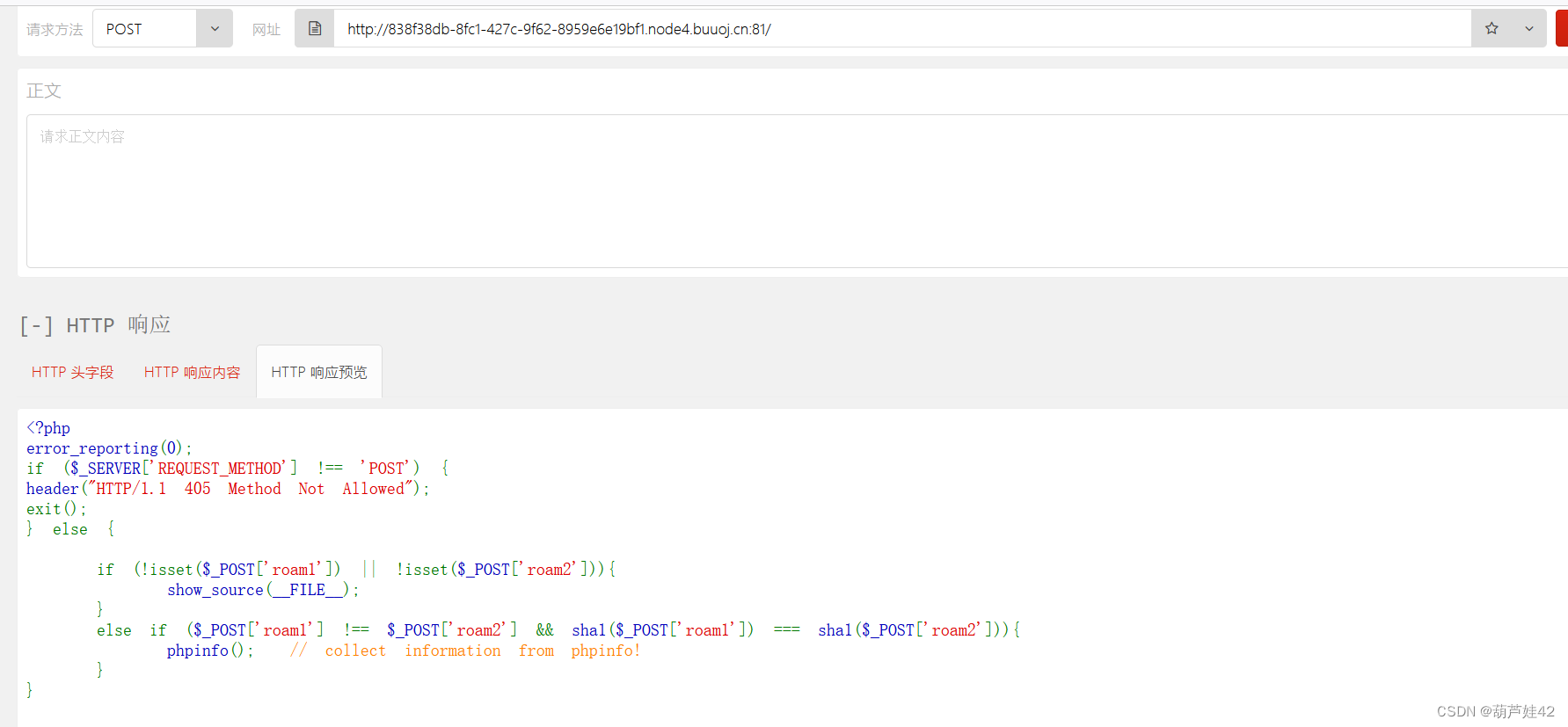 访问进去之后发现是空白页面,扫目录也扫不出来。burp抓包 响应码为405