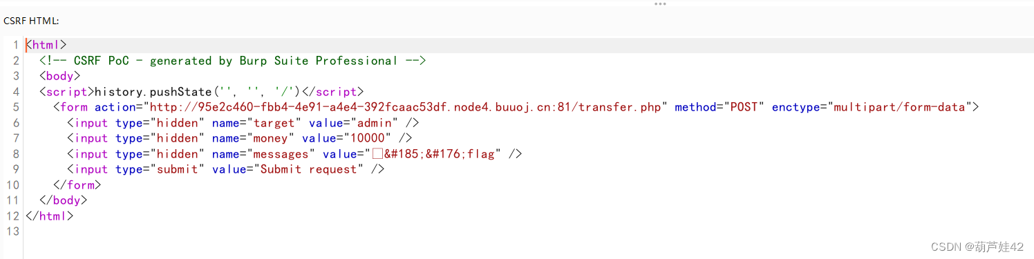 这个题目可以利用CSRF漏洞进行攻击,但是需要自己写一个页面让后台点击,接着会自动跳转到转账页面,让服务器以为是后台转账操作。