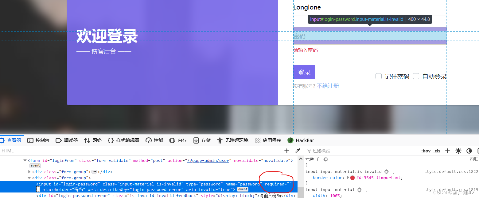 但是我们清除了cookie中的PHPSESSID,还是无法登录。因为前端把这里设置为了必填的选项。前端是可修改的,HTML中 required 属性规定必需在提交之前填写输入字段。直接找到它把它删了