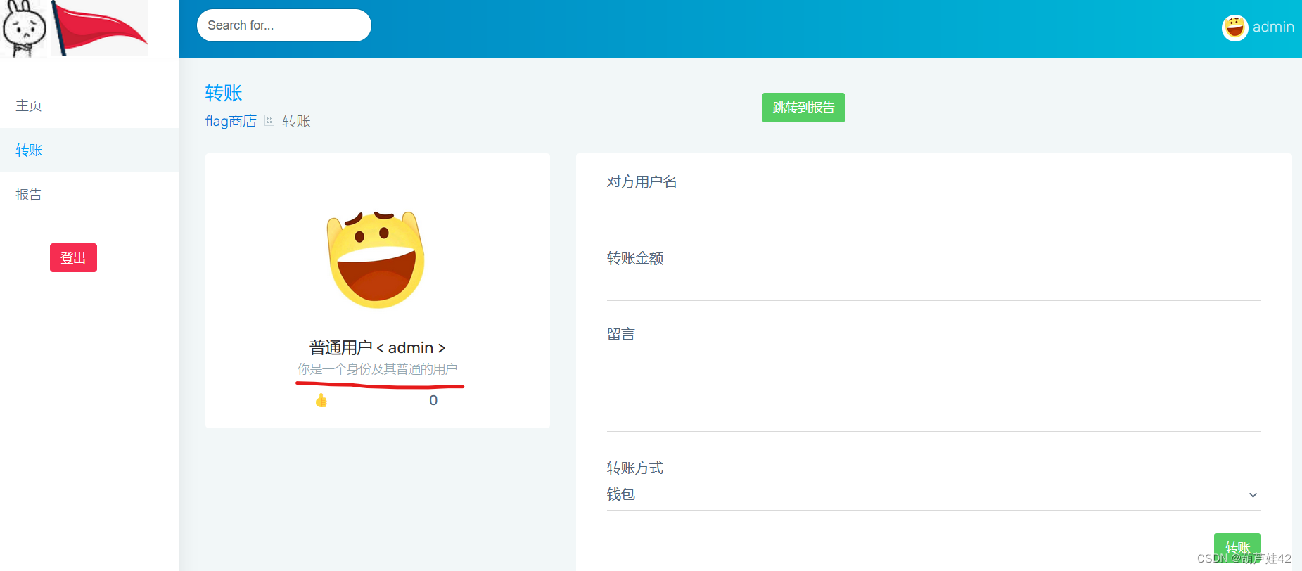 再结合此题我们的情况 钱不够,还有转账功能,Lonelone是财务部负责人,钱大大滴多。 可以得出应该是存在csrf漏洞,诱导Lonelone在报告处点击恶意链接从而转账使得自己的钱丢失。
