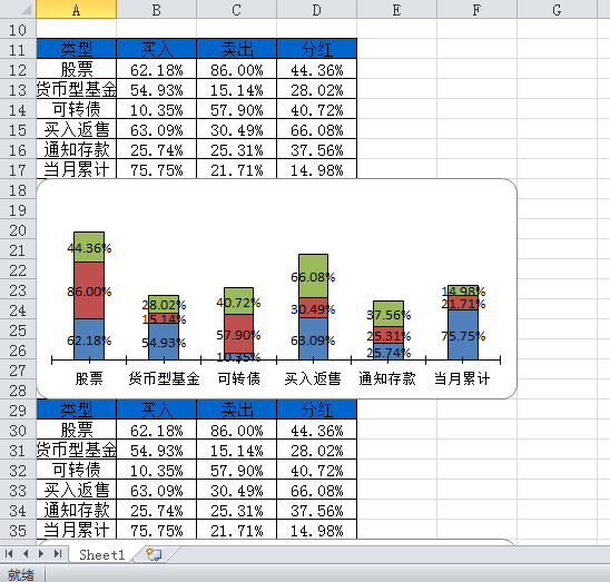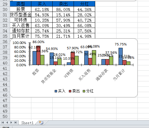 import org.openxmlformats.schemas.drawingml.x2006.chart.STTickLblPos;public class ExcelChartUtil {public static void main(String[] args) throws Exception {boolean result=false;List dataList=new ArrayList();//数据List fldNameArr = new ArrayList();// 字段名List titleArr = new ArrayList();// 标题BaseFormMap baseFormMap=new BaseFormMap();List showtailArr=new ArrayList();List ispercentArr=new ArrayList();baseFormMap.put("value1", "股票");baseFormMap.put("value2", new BigDecimal(new java.util.Random().nextDouble()));baseFormMap.put("value3", new BigDecimal(new java.util.Random().nextDouble()));baseFormMap.put("value4", new BigDecimal(new java.util.Random().nextDouble()));BaseFormMap baseFormMap1=new BaseFormMap();baseFormMap1.put("value1", "货币型基金");baseFormMap1.put("value2", new BigDecimal(new java.util.Random().nextDouble()));baseFormMap1.put("value3", new BigDecimal(new java.util.Random().nextDouble()));baseFormMap1.put("value4", new BigDecimal(new java.util.Random().nextDouble()));BaseFormMap baseFormMap2=new BaseFormMap();baseFormMap2.put("value1", "可转债");baseFormMap2.put("value2", new BigDecimal(new java.util.Random().nextDouble()));baseFormMap2.put("value3", new BigDecimal(new java.util.Random().nextDouble()));baseFormMap2.put("value4", new BigDecimal(new java.util.Random().nextDouble()));BaseFormMap baseFormMap3=new BaseFormMap();baseFormMap3.put("value1", "买入返售");baseFormMap3.put("value2", new BigDecimal(new java.util.Random().nextDouble()));baseFormMap3.put("value3", new BigDecimal(new java.util.Random().nextDouble()));baseFormMap3.put("value4", new BigDecimal(new java.util.Random().nextDouble()));BaseFormMap baseFormMap4=new BaseFormMap();baseFormMap4.put("value1", "通知存款");baseFormMap4.put("value2", new BigDecimal(new java.util.Random().nextDouble()));baseFormMap4.put("value3", new BigDecimal(new java.util.Random().nextDouble()));baseFormMap4.put("value4", new BigDecimal(new java.util.Random().nextDouble()));BaseFormMap baseFormMap5=new BaseFormMap();baseFormMap5.put("value1", "当月累计");baseFormMap5.put("value2", new BigDecimal(new java.util.Random().nextDouble()));baseFormMap5.put("value3", new BigDecimal(new java.util.Random().nextDouble()));baseFormMap5.put("value4", new BigDecimal(new java.util.Random().nextDouble()));fldNameArr.add("value1");fldNameArr.add("value2");fldNameArr.add("value3");fldNameArr.add("value4");titleArr.add("类型");titleArr.add("买入");titleArr.add("卖出");titleArr.add("分红");showtailArr.add("0");showtailArr.add("2");showtailArr.add("2");showtailArr.add("2");ispercentArr.add("0");ispercentArr.add("1");ispercentArr.add("1");ispercentArr.add("1");dataList.add(baseFormMap);dataList.add(baseFormMap1);dataList.add(baseFormMap2);dataList.add(baseFormMap3);dataList.add(baseFormMap4);dataList.add(baseFormMap5);SXSSFWorkbook wb = new SXSSFWorkbook();SXSSFSheet sheet = wb.createSheet("Sheet1");result=createChart(wb,sheet,10,"bar",STBarGrouping.STACKED,false,false,dataList, fldNameArr, titleArr,showtailArr,ispercentArr);result=createChart(wb,sheet,10+dataList.size()+12,"bar",STBarGrouping.CLUSTERED,true,true,dataList, fldNameArr, titleArr,showtailArr,ispercentArr);//System.out.println(ctChart);System.out.println(result);FileOutputStream fileOut = new FileOutputStream("D://BarChart.xlsx");wb.write(fileOut);fileOut.close();}/*** @Description: 创建Excel数据* @param wb:工作薄* @param sheet:wb.createSheet();* @param dataList* @param fldNameArr* @param titleArr* @param showtailArr* @param ispercentArr* @param position:从第几行开始(0:就是第一行)* @return boolean*/public static boolean refreshChartExcel(SXSSFWorkbook wb,SXSSFSheet sheet,List dataList,List fldNameArr,List titleArr,List showtailArr,List ispercentArr,int position) {boolean result = true;//样式准备CellStyle style = wb.createCellStyle();style.setFillForegroundColor(IndexedColors.ROYAL_BLUE.getIndex());style.setFillPattern(FillPatternType.SOLID_FOREGROUND);style.setBorderBottom(BorderStyle.THIN); //下边框style.setBorderLeft(BorderStyle.THIN);//左边框style.setBorderTop(BorderStyle.THIN);//上边框style.setBorderRight(BorderStyle.THIN);//右边框style.setAlignment(HorizontalAlignment.CENTER);CellStyle style1 = wb.createCellStyle();style1.setBorderBottom(BorderStyle.THIN); //下边框style1.setBorderLeft(BorderStyle.THIN);//左边框style1.setBorderTop(BorderStyle.THIN);//上边框style1.setBorderRight(BorderStyle.THIN);//右边框style1.setAlignment(HorizontalAlignment.CENTER);CellStyle cellStyle = wb.createCellStyle();cellStyle.setBorderTop(BorderStyle.THIN);//上边框cellStyle.setBorderBottom(BorderStyle.THIN); //下边框cellStyle.setBorderLeft(BorderStyle.THIN);//左边框cellStyle.setBorderRight(BorderStyle.THIN);//右边框cellStyle.setAlignment(HorizontalAlignment.CENTER);//水平对齐方式//cellStyle.setVerticalAlignment(VerticalAlignment.TOP);//垂直对齐方式//根据数据创建excel第一行标题行for (int i = 0; i < titleArr.size(); i++) {if(sheet.getRow(position)==null){sheet.createRow(position).createCell(i).setCellValue(titleArr.get(i)==null?"":titleArr.get(i));}else{sheet.getRow(position).createCell(i).setCellValue(titleArr.get(i)==null?"":titleArr.get(i));}//标题行创建背景颜色sheet.getRow(position).getCell(i).setCellStyle(style);}//遍历数据行for (int i = 0; i < dataList.size(); i++) {BaseFormMap baseFormMap = dataList.get(i);//数据行//fldNameArr字段属性for (int j = 0; j < fldNameArr.size(); j++) {if(sheet.getRow(position+i+1)==null){if(j==0){try {sheet.createRow(position+i+1).createCell(j).setCellValue(((String) baseFormMap.get(fldNameArr.get(j)))==null?"":((String)baseFormMap.get(fldNameArr.get(j))));} catch (Exception e) {// TODOif((String)baseFormMap.get(fldNameArr.get(j))==null){sheet.createRow(position+i+1).createCell(j).setCellValue("");}else{sheet.createRow(position+i+1).createCell(j).setCellValue((Date)baseFormMap.get(fldNameArr.get(j)));}}}//标题行创建背景颜色sheet.getRo