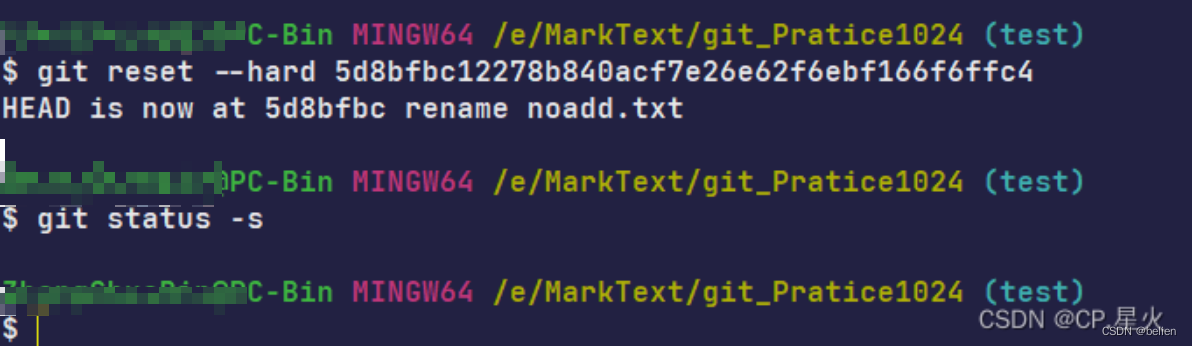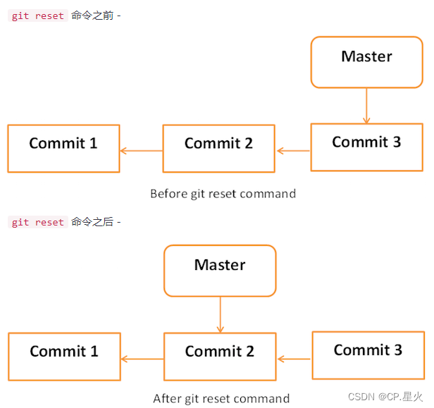 --mixed:将从尚未提交的暂存区域还原这些更改。它仅从暂存区域恢复更改。对文件的工作副本进行的实际更改不受影响。默认 Git 复位等效于执行