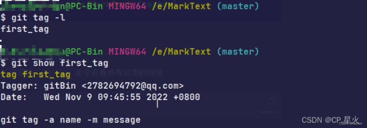 $ git tag -a 'first_tag' -m 'git tag -a name -m message'