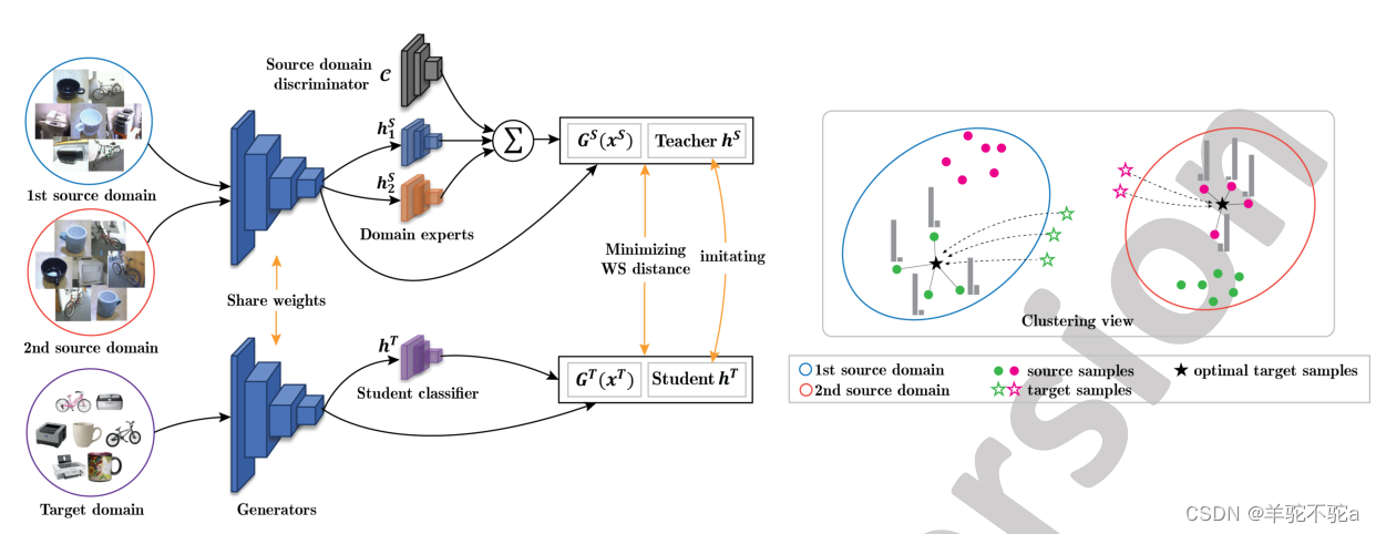 图2:左:我们提出的多源域自适应方法的总体结构。MOST由两个合作代理组成:一个专家教师