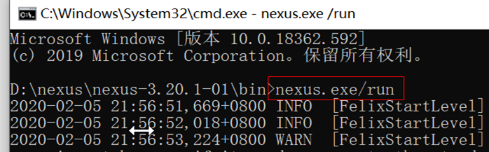 切换到nexus-3.20.1-01\bin下输入nexus.exe/run 或者 D:\nexus\nexus-3.20.1-01\bin>nexus.exe /run