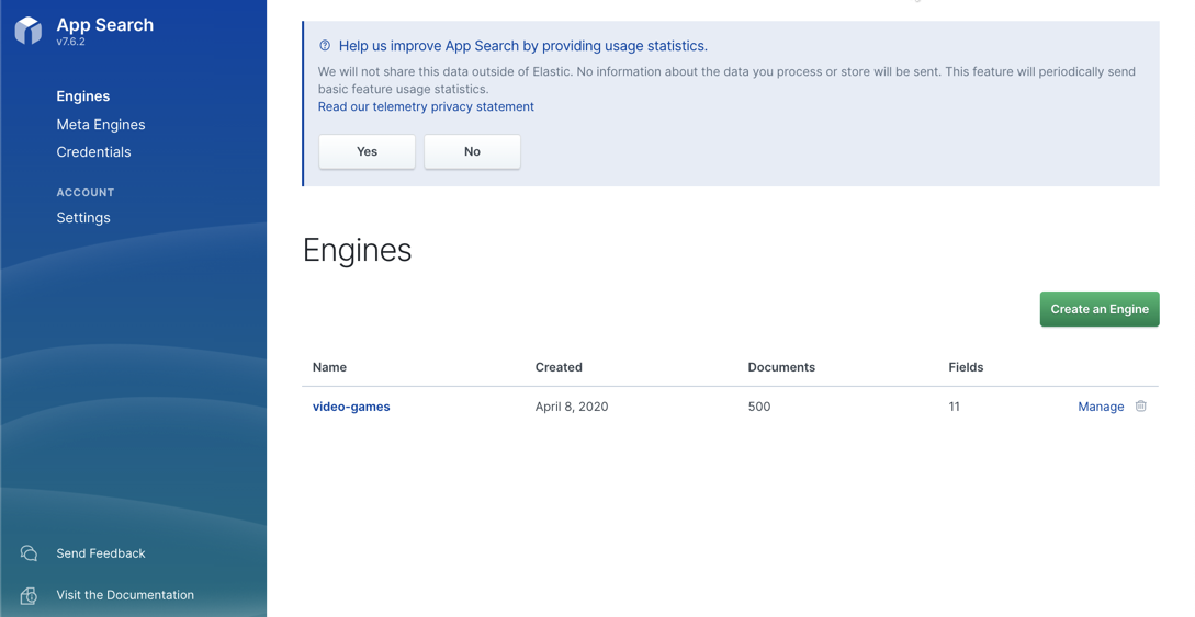 在 Engine name 里,我们输入 video-games,并点击上面的 Continue 按钮: