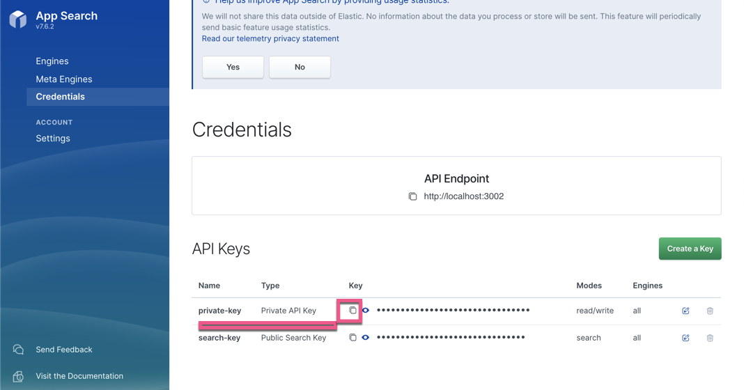 我们可以点击 copy 图标来得到我们所需要的 private-key。按照同样的方法,我们也可以得到 search-key。