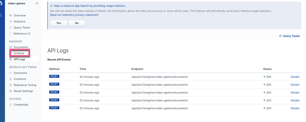 从上面我们可以看到整个 video-engine 的统计情况。它显示我们共用500个文档。同时我们也可以看到所有的 API 的使用情况。如果你发现有任何的问题,你可以点击 View API Logs 来查看 API 的使用情况: