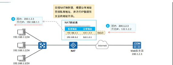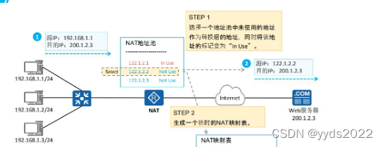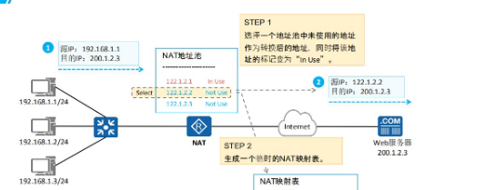 送数据时,与之对应 的公有地址也处于使用状态。为了避免地址浪费,动态NAT提 出了地址池的