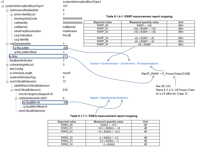 在上面公式使用的变量中,只有 Q r x l e v m e a s \mathrm{Q_{rxlevmeas}} Qrxlevmeas和 Q q u a l m e a s \mathrm{Q_{qualmeas}} Qqualmeas是UE在开机时真正测量的值,其他大多数参数是由特定的SIB(在LTE情况下为SIB1)决定的,或者是由一些其他预定义值计算的。