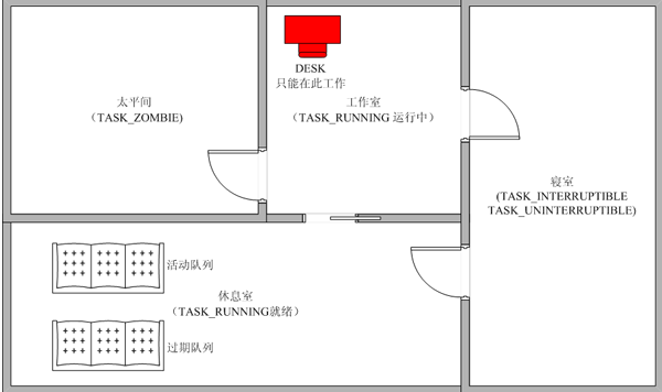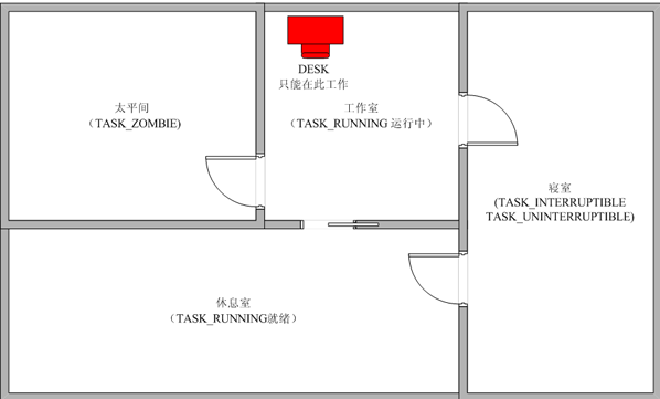 其他人呢,要么在休息室时短暂地休息(对应TASK_RUNNING就绪状态),要么就在寝室Sleep(对应TASK_INTERRUPTABLE或TASK_UNINTERRUPTABLE),要么就是死人了,在停尸间(TASK_ZOMBIE)。