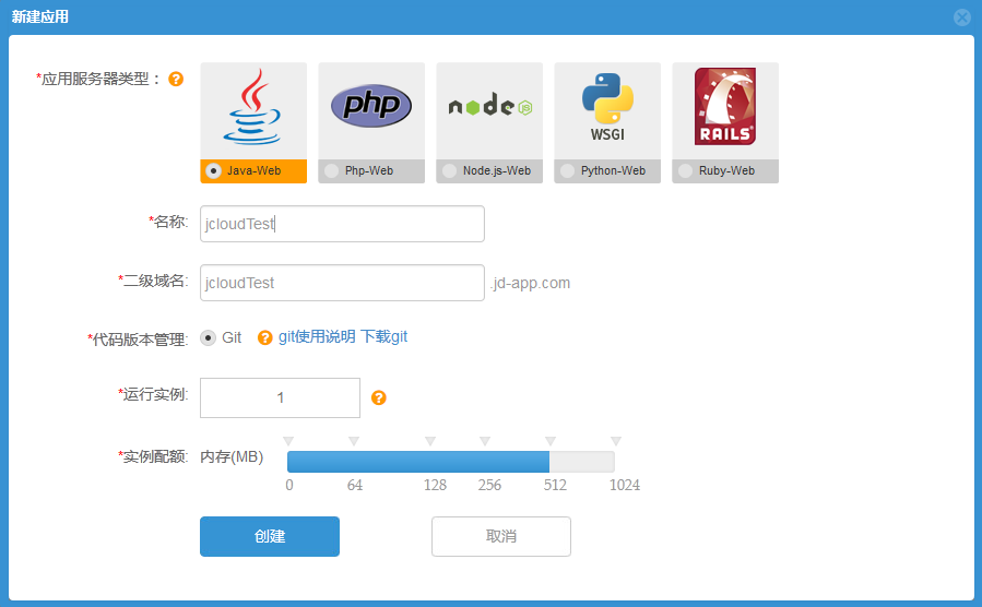 这里创建的是一个非常简单的例子应用。如图我这个应用的访问网址是:http://jcloudTest.jd-app.com