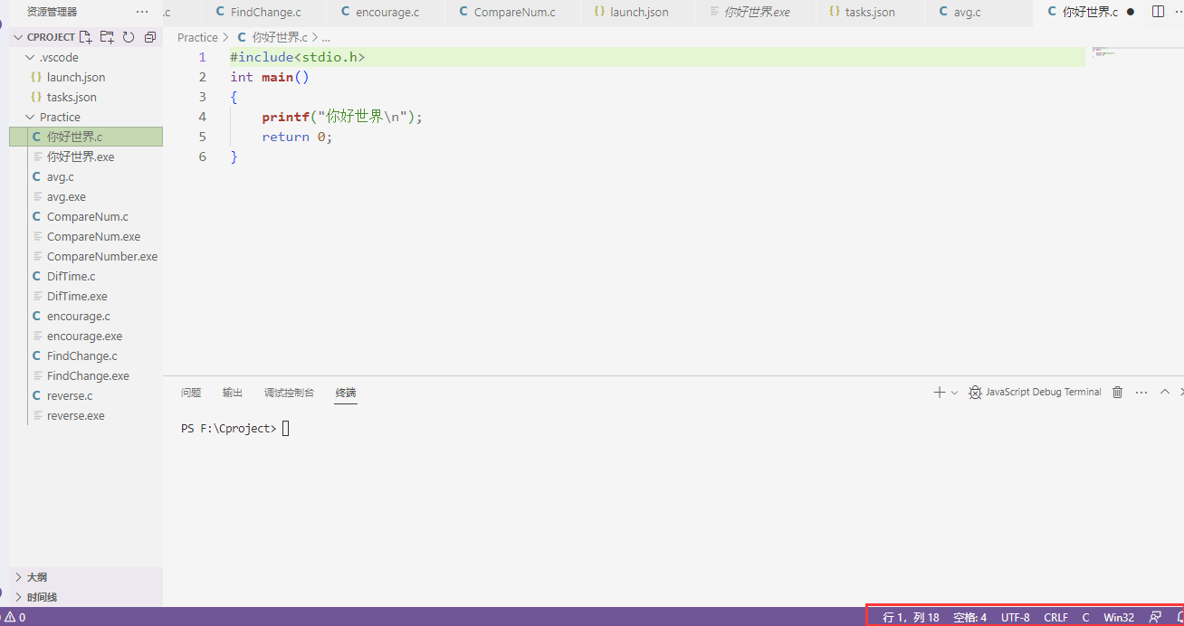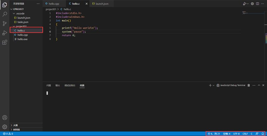 VsCode在运行编码文件时内部的终端编码格式为UTF-8。如下图所示:使用VsCode内的终端运行一个简单的c语言程序,得到如下图所示: