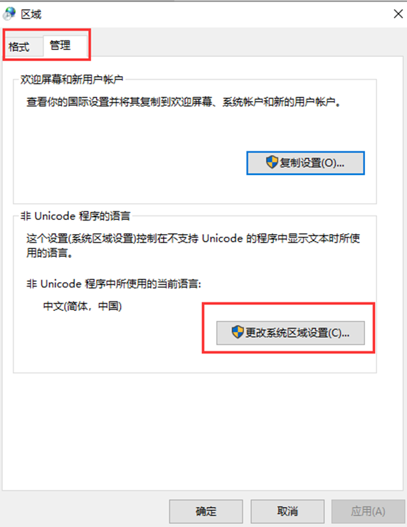 点击“管理”,点击“更改系统区域设置”。