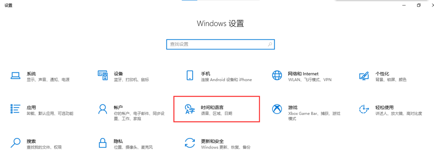 打开电脑的设置,点击“时间和语言”,如下图所示: