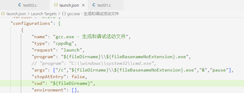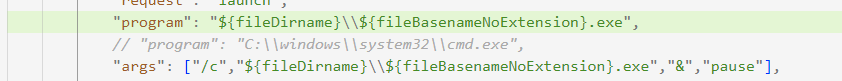 故在启用断点调试时无法根据方案一解决cmd窗口闪退的问题,此时可以采用解决窗口闪退问题的方案二,不改变默认文件中的program配置,或者放弃使用断点调试。我的做法是在launch.json文件中