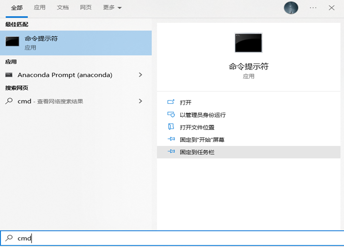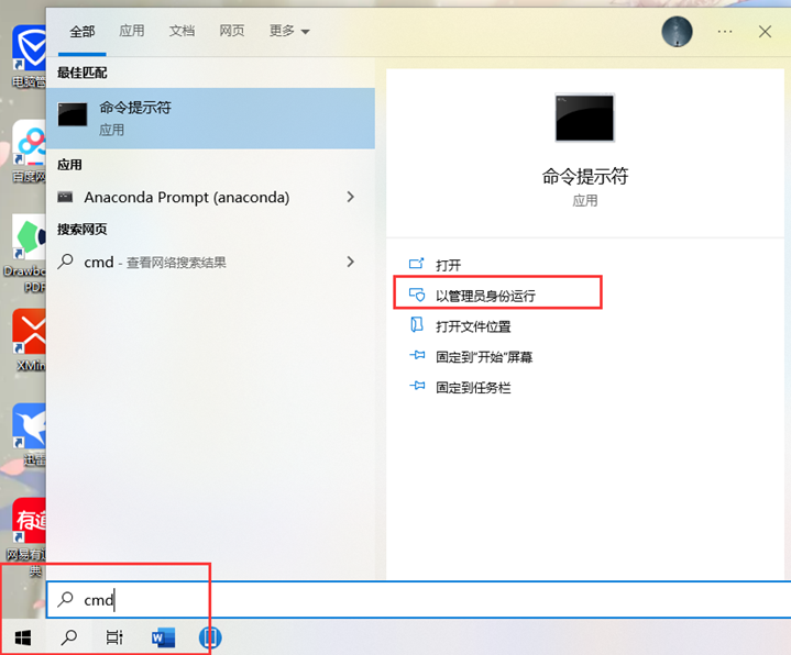 在电脑屏幕左下角的搜索框中输入“cmd”,点击”以管理员身份运行”。(弹出是否运行框选择是)。
