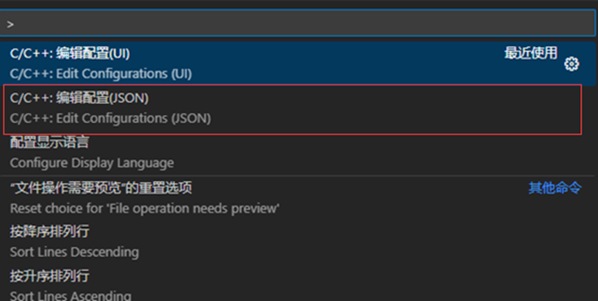 第一步:一般来说这里会直接弹出“C/C++编辑配置”,若没有弹出也可以在搜索框中输入这一个配置名称,这里选择打开后缀名为JSON的编辑配置。