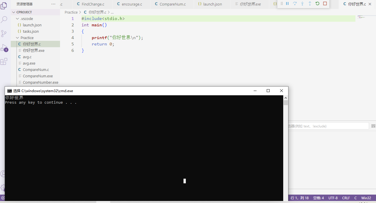 然后点击打开hello.c文件,点击运行,便可以通过cmd窗口运行程序了。但是此时会出现两个问题,窗口一闪而过的问题与cmd终端输出中文出现乱码的问题。