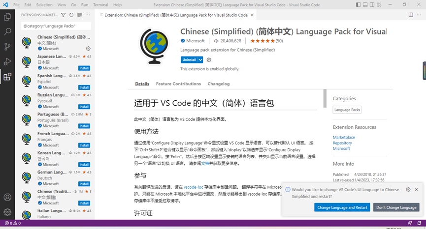 在扩展中搜索“Chinese”选择中文简体,然后点击install,安装完成后右下角出现是否应用的弹窗提示。
