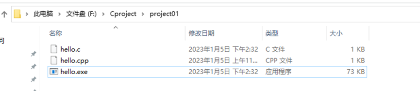 这样做的优点是可以使以后写的代码程序在VsCode中编译运行时,在cmd终端中不会闪退。但是缺点是,若从计算机中找到生成的hello.exe文件,直接点击运行那么程序仍然会闪退。即来到如图所示的路径下点开hello.exe文件,发现程序闪退。所以需要方案二。