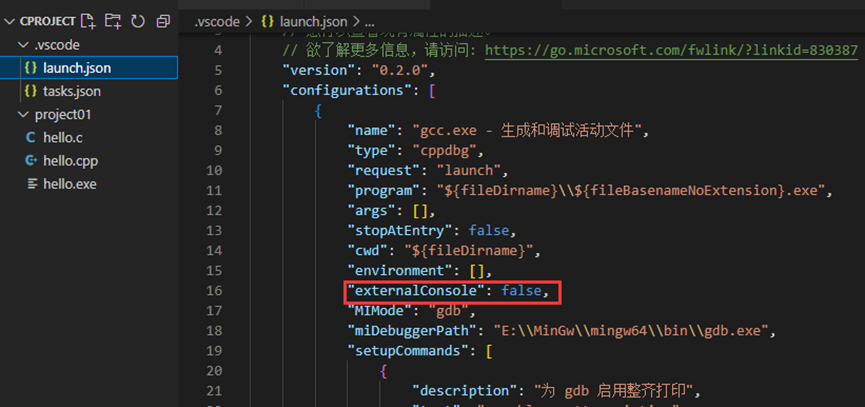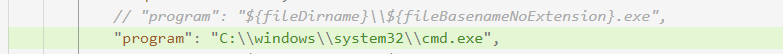 VsCode在默认生成的launch.json文件下编译运行时,不会产生断点调试无效的问题。但根据本文中为解决“窗口一闪而过的问题”的方案一修改launch.json文件后会出现设置断点调试无效的问题。原因是在方案一中将program后更改为了使用cmd终端,如图所示: