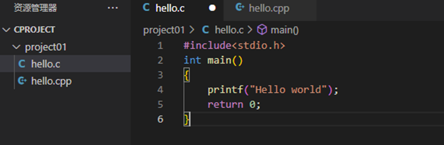 在第一个.c文件中输入一段简单的C语言代码。