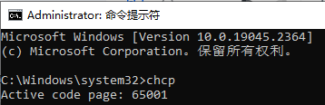 重启后打开cmd终端,在其中输入chcp,会发现变为编码变为了“65001”即UTF-8格式编码。