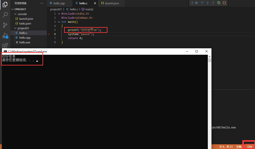 更改后再次来到VsCode中以方案一中的program运行编译程序,注意代码文件也应改为UTF-8编码格式,此时便可以正常输出了。