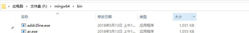 打开mingw64文件夹->打开里面的bin文件夹(此处仅显示了bin内的两个文件,实际不止)。
