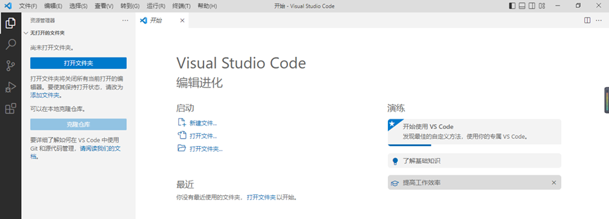将下载好的zip文件用解压软件解压到此文件夹中。解压完成后即安装好了VsCode。安装成功后即如下图所示。