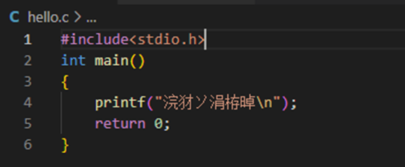 此时根据之前的方法切换到cmd终端运行,由于cmd终端的编码为GBK编码,hello.c文件是UTF-8编码,由于编码格式不一致故此时会显示中文乱码。如下图。