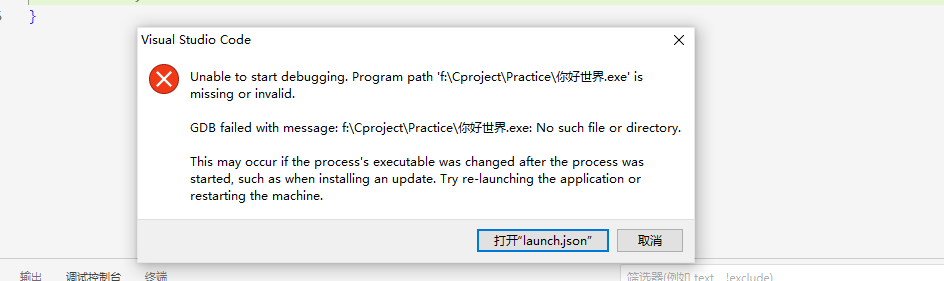 文件路径中含中文名称,当以VsCode默认启动程序启动时会报如图所示的错误。(以建立一个"你好世界.exe"为例)。