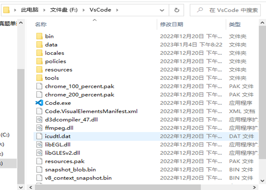 在上图所示的文件夹中建立data文件夹。这是因为直接打开Code.exe会导致以后的扩展程序会安装在C盘当中,因为VsCode默认在C盘建立你的数据文件。此时建立data文件,在以后使用VsCode的过程中,产生的用户数据与扩展程序都会存入这个data文件中。(这种更改扩展安装位置的方法,仅适用于通过Zip下载的VsCode软件。)