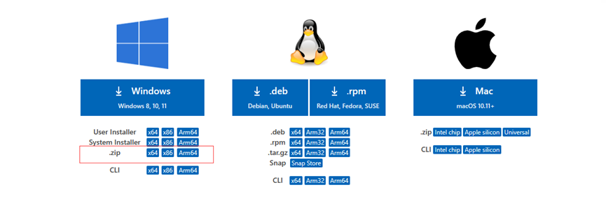 Download Visual Studio Code -Mac, Linux, Windows。点击官网链接,根据自己电脑的操作系统下载即可。建议下载zip格式,因为exe格式安装后更改VsCode扩展安装位置时会有较多的操作步骤。点击x64。