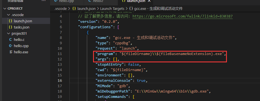 而默认生成的launch.json文件中的program为: