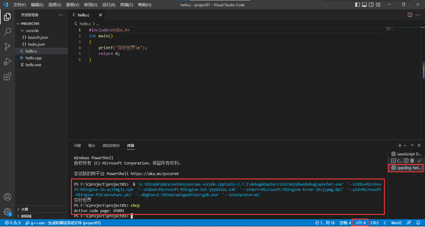 在此可以看到,VsCode将程序运行到了cppdbg这个终端,而在这个终端中输入“chcp”,查看这个终端的编码为“65001”,即UTF-8编码,而此时左下角显示UTF-8是hello.c文件编码,所以此时运行的结果“你好世界”,不会出现乱码。