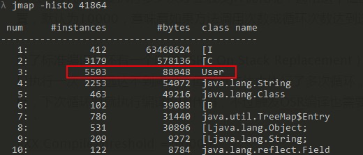 那么如果把CompileThreshold设置适当小一点,是不是可以提早触发编译行为,减少在堆上生成User对象?我们可以进行通过不同参数验证一下: 1、-XX:CompileThreshold = 5000,结果如下:
