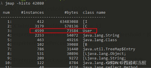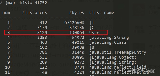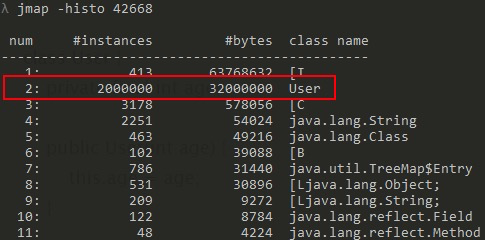 1、通过java -cp . -Xmx3G -Xmn2G -server -XX:-DoEscapeAnalysis JVM运行代码,-XX:-DoEscapeAnalysis关闭逃逸分析,通过jps查看java进程的PID,接着通过jmap -histo [pid]查看java堆上的对象分布情况,结果如下: