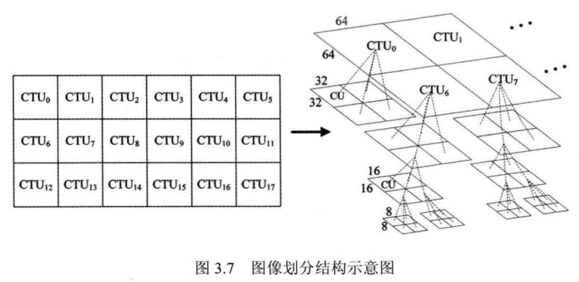 一幅图像可以被划分为若干个不重叠的CTU,CTU内部采用四叉树划分为CU