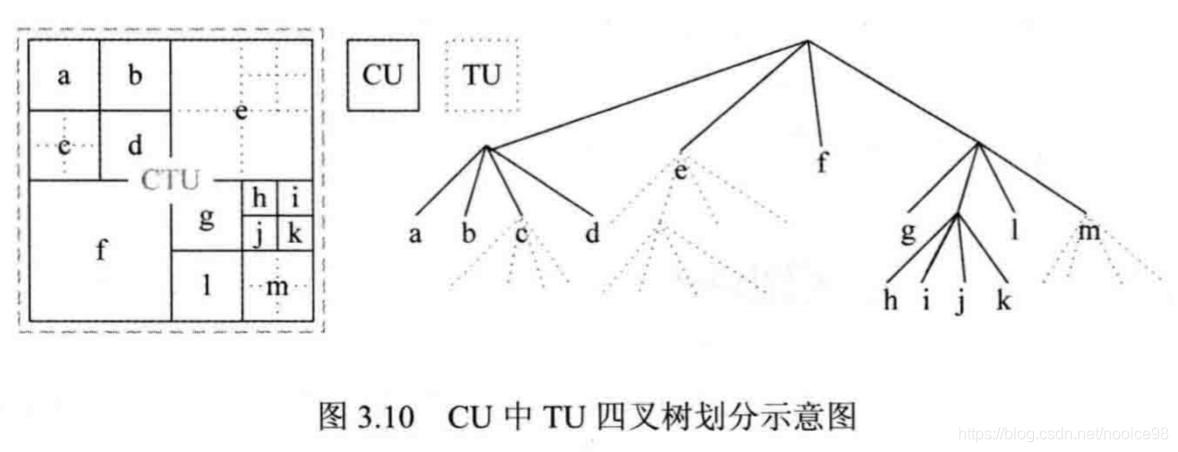 - 在一个CU内,允许TU跨越多个PU,以四叉树的形式递归划分。