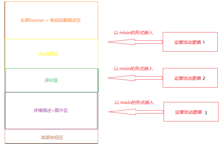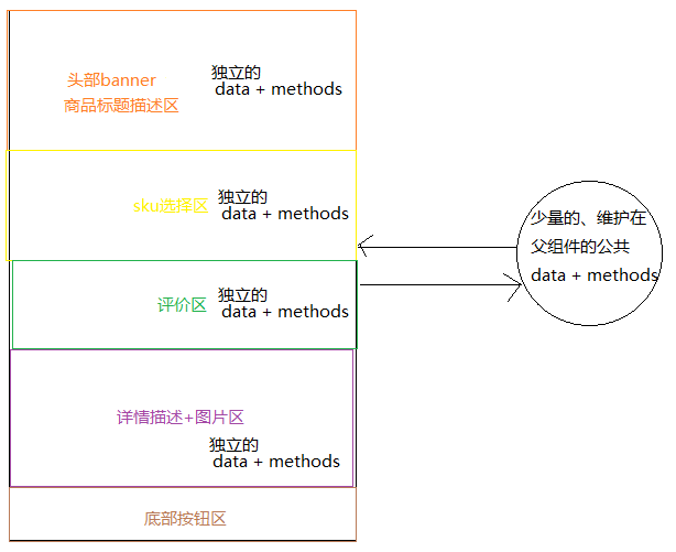 例如,对于详情页来说,一般都可以分为 头部banner + 商品标题描述区、sku选择区、评价区、详情描述+图片区、底部按钮区,这些区域基本上都是可以相互独立存在的,或者说耦合性很低,可以看成独立的组件进行维护管理