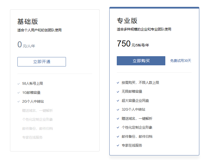 腾讯企业邮箱分免费版和收费版,区别如下