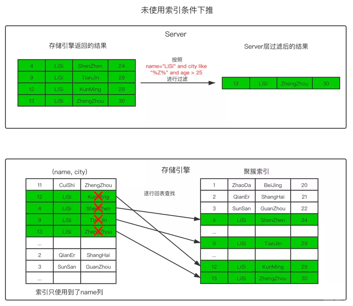 city列,存储引擎直接在联合索引中按city like "%Z%"进行过滤,过滤后剩下2条记录; - 根据过滤后的记录的id值,逐一进行回表扫描,去聚簇索引中取出完整的行记录,并把这些记录返回给