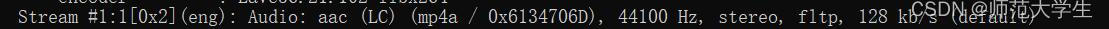 从上图可知,音频流的压缩方式(编码方式)是AAC,封装格式是MP4A,采用的Profile是LC规格,采样率是44.1kHZ,声道数是立体声,数据表示类型为浮点型 ,音频流的比特率是128kb/s,显然音频流比视频流占用资源更少。