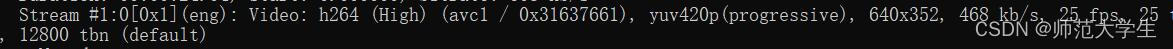从上图可知,视频流的压缩方式(编码方式)是H264,封装格式是AVC1,每一帧的数据是YUV420P的格式,分辨率是640*352,视频流的比特率是468kb/s,帧率是25帧每秒。