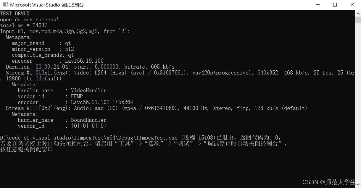 {const char* path = "ds.mov";//记录视频源文件的路径,这里视频文件ds.mov直接放在项目工程里面了,所以可以直接用视频名称//如果视频不在项目工程里面,路径的书写格式举例:D:\\code of visual studio\\ffmpegTest\\ffmpegTest\\ds.mov//路径要使用“\\”,不然会被视为转义字符cout << "TEST DEMUX" << endl;//初始化封装库//在新版本中av_register_all()被弃用了,可以根据代码里有无此函数判断ffmpeg版本//初始化网络库(可以打开rtsp,rtmp,http协议的流媒体视频)avformat_network_init();//解封装上下文AVFormatContext* ic = nullptr;//将其地址做为输入,会申请一块空间,将这块空间的地址赋给ic//解封装上下文AVFormatContext,是存储音视频封装格式中包含信息的结构体。//对视频文件进行解封装操作int re = avformat_open_input(&ic, path, 0, nullptr);//0表示自动选择解封装器,设置一个返回值知道有无错误if (re != 0)//如果返回值不是0,说明打开出现错误{char buf[1024] = { 0 };av_strerror(re, buf, sizeof(buf) - 1);//记录错误cout << "open" << path << "failed!:" << buf << endl;//提示错误return -1;}cout << "open " << path << " success!" << endl;//提示成功//获取视频流的信息re = avformat_find_stream_info(ic, 0);//自行计算视频的总时长,以毫秒为单位,AV_TIME_BASE为1秒时长int total = ic->duration / (AV_TIME_BASE/1000);cout << "total ms = " << total << endl;//获取视频流的详细信息,包括视频流与音频流av_dump_format(ic, 1, "2", 0);if (ic) {//如果封装上下文仍存在avformat_close_input(&ic);//释放资源,指针置零ic = nullptr;}return 0;