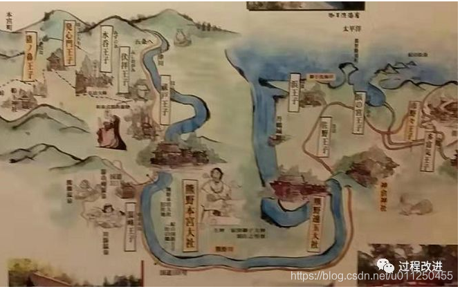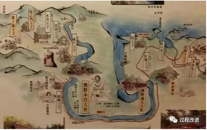 我们这次走的中边路,从海边的田边市一直向东出发,花了3天时间,到达熊野本宫大社,然后再花一天时间到达坐落在东面海边的日本最高瀑布对面的熊野那智大社结束,详见下面的熊野古道地图: